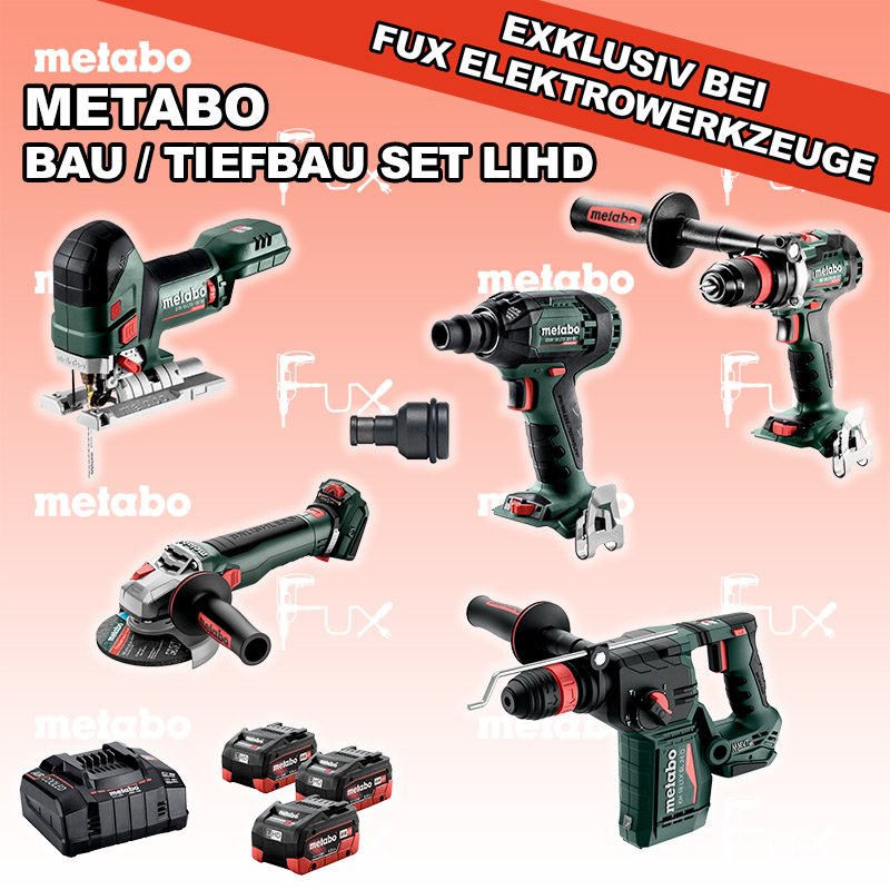Das Ladenlokal bleibt vom 25. Dezember 2025 bis am 04. Januar 2026 geschlossen. Bestellungen und Lieferungen von Neugeräten werden trotz Ferienabwesenheit in gewohnter Fux-Manier entgegengenommen und ausgeliefert. Heute auf dieses Produkt 31% Rabatt! Zu "Bau / Tiefbau Set" von Metabo FULL Service: 36 Monate zum Nulltarif für Sie! Weitere Infos zum FULL Service Sparfux Aktionen FUX SPECIAL EXKLUSIV BEI FUX Metabo Bau / Tiefbau Set 1 Bestell- und Artikelnummer: Bau / Tiefbau Set 1 BS 18 LTX BL Q I Akku-BohrschrauberAkkuspannung 18 V Drehzahl 0-550 / 0-2000 U/min Drehmoment hart / weich 130 / 65 Nm Gewicht (mit Akkupack) 2.3 kgInfos STA 18 LTX 150 BL Akku-StichsägeAkkuspannung 18 V Hubzahl 1.000-3.500 /min Gewicht ohne Akkupack 1.9 kgInfos KH 18 LTX BL 24 Q Akku-KombihammerAkkuspannung 18 V Einzelschlagstärke 2.2 J Bohrleistung in Beton 24 mm Gewicht ohne Akkupack 3 kgInfos WVB 18 LT BL 11-125 Quick Akku-WinkelschleiferAkkuspannung 18 V Drehzahl 2.800 - 10.000 / min Ø 125 mm Scheiben Gewicht (mit Akkupack) 2.5 kgInfos SSW 18 LTX 300 BL Akku-SchlagschrauberAkkuspannung 18 V Anziehdrehmoment 300 Nm Werkzeugaufnahme 1/2" Gewicht 1.7 kgInfos Reduktions Adapter 1/2" auf 1/4" Aufnahme Max. 350 Nm Länge 45 mmInfos 3 x 18 V, 5.5 Ah, LiHD Akkupack18 V 5.5 Ah ( LiHD Akkus ) Infos ASC 145, 12 - 36 V "Air Cooled" LadegerätZum Aufladen aller Li-Power Schiebesitz-Akkupacks (12 V - 36 V). Ladestrom 8.0 AInfos Standard-Ausrüstung In diesem Set enthalten: BS 18 LTX BL Q I Akku-Bohrschrauber STA 18 LTX 150 BL Akku-Stichsäge KH 18 LTX BL 24 Q Akku-Kombihammer WVB 18 LT BL 11-125 Quick Akku-Winkelschleifer SSW 18 LTX 300 BL Akku-Schlagschrauber Reduktions Adapter 3 x 18 V, 5.5 Ah, LiHD Akkupack ASC 145, 12 - 36 V "Air Cooled" Ladegerät Listenpreis CHF 2'252.00 Fuxpreis CHF 1'539.00 inkl. 8.1% MwSt, inkl vRG Frankolieferung Kein Grauimport! Produkt bestellen 1 Stück 2 Stück 3 Stück 4 Stück 5 Stück 6 Stück 7 Stück 8 Stück 9 Stück 10 Stück Alle Angaben ohne Gewähr und solange Vorrat reicht!Wiederverkäufer werden? Produkt als PDF NEUHEITAKTION 31%