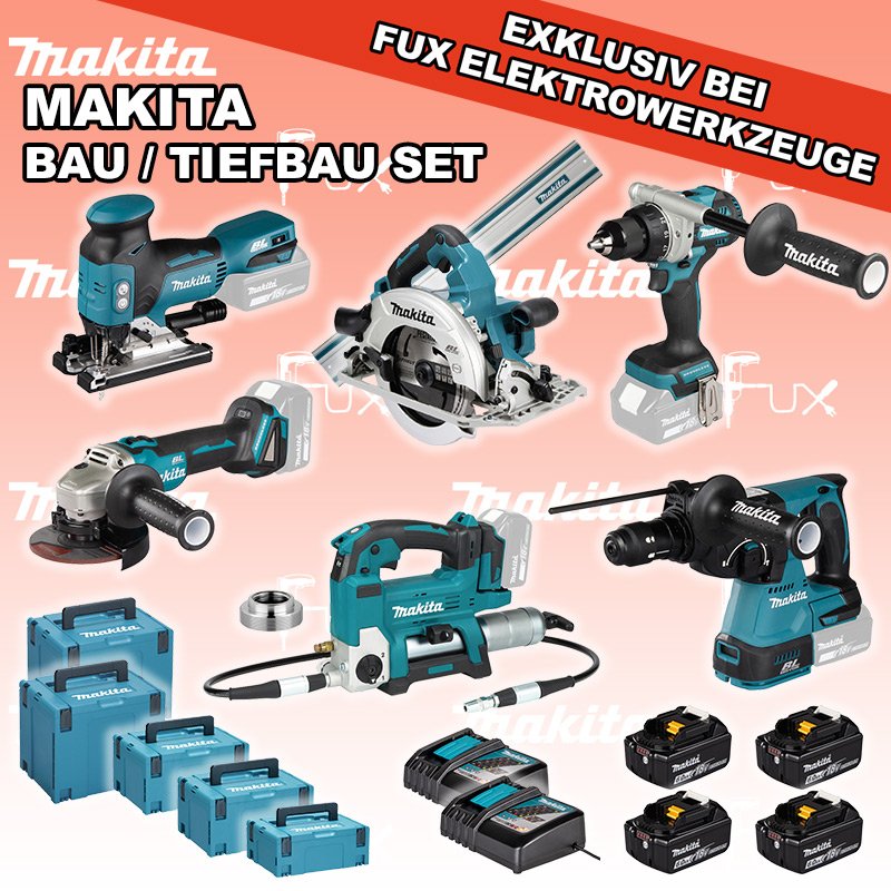 Das Ladenlokal bleibt vom 25. Dezember 2025 bis am 04. Januar 2026 geschlossen. Bestellungen und Lieferungen von Neugeräten werden trotz Ferienabwesenheit in gewohnter Fux-Manier entgegengenommen und ausgeliefert. Heute auf dieses Produkt 32% Rabatt! Zu "Bau / Tiefbau Set" von Makita Sparfux Aktionen FUX SPECIAL EXKLUSIV BEI FUX Makita Bau / Tiefbau Set 6 Bestell- und Artikelnummer: maBau / Tiefbau Set 6 DDF492Z Akku-BohrschrauberAkkuspannung 18 V Leerlaufdrehzahl 0 - 550 / 0 - 2100 min⁻¹ Drehmoment hart / weich 130 / 65 Nm Gewicht inkl. Akku 2.3 - 2.6 kgInfos DJV18ZJ Akku-StichsägeAkkuspannung 18 V Hubzahl 800 - 3500/ min Schnittleistung Holz 135 mm / Stahl 10 mm Gewicht 2.5 kgInfos DHR243ZJ Akku-BohrhammerAkkuspannung 18 V Einzelschlagstärke 2.0 J ( EPTA ) Bohrleistung in Beton 24 mm Gewicht 3.4 kgInfos DGA506ZJ Akku-WinkelschleiferAkkuspannung 18 V Drehzahl 9000 U / min Scheibendurchmesser 125 mm Gewicht 2,5 kgInfos DGP180Z Akku-FettpresseAkkuspannung 18 V Maximaler Druck 690 bar Auspressgeschwindigkeit 145 / 290 ml/min Gewicht inkl. Akku 6.1 kgInfos DHS782ZJ Akku-HandkreissägeAkkuspannung 2 x 18 V Sägeblatt (Ø) 190 mm Schnitttiefe bei 90° 62.5 mm Gewicht 5.1 kg Infos 4 x BL 1860 B ( Li-Ion Akku )18 V 6.0 Ah ( Li-Ion Akku ) Infos 2 x DC 18 RC Schnell-Ladegerätfür Akkus 14.4 - 18 Volt ( Li-Ion Akkus )Infos Führungsschiene L = 140 cmgeeignet für SP6000 Handkreissäge mit passenden Adapter Auch für weitere Handkreissägen und Stichsägen geeignet mit passendem Adapter. ( 194579-2 )Infos Adapter für Lube-Shuttle® 400GAdapter zum Umrüsten von Fettbehälter auf Lube-Shuttle®* Kartusche 400g geeignet für FP 18 LTXInfos MAKPAC Gr. 2Produktabmessung (L x B x H) 395 x 295 x 163 mm Infos Einsatz für diverse Akkuschrauber Einsatz für DDF343ZJ, DDF441, DDF446, DDF448, DDF451, DDF453, DDF456R, DDF458, DDF459, DDF480, DDF481, DDF482, DDF484, DDF485, DDF486, DHP441, DHP446, DHP448, DHP451, DHP456, DHP458, DHP459, DHP470, DHP480, DHP481, DHP482, DHP484, DHP485, DHP486, DLX2126TJ1, DLX3092TJInfos Standard-Ausrüstung In diesem Set enthalten: DDF492Z Akku-Bohrschrauber DJV18ZJ Akku-Stichsäge DHR243ZJ Akku-Bohrhammer DGA506ZJ Akku-Winkelschleifer DGP180Z Akku-Fettpresse DHS782ZJ Akku-Handkreissäge 4 x BL 1860 B ( Li-Ion Akku ) 2 x DC 18 RC Schnell-Ladegerät Führungsschiene L = 140 cm Adapter für Lube-Shuttle® 400G MAKPAC Gr. 2 Einsatz für diverse Akkuschrauber Geliefert im KofferDGP180Z Akku-Fettpresse ohne Koffer Zubehör Listenpreis CHF 3'257.00 Fuxpreis CHF 2'215.00 inkl. 8.1% MwSt, inkl vRG Versand CHF 20.00 Kein Grauimport! Produkt bestellen 1 Stück 2 Stück 3 Stück 4 Stück 5 Stück 6 Stück 7 Stück 8 Stück 9 Stück 10 Stück Option: Makita BL 1860 B ( Li-lon Akku ) für CHF 95.- statt CHF 124.-Infos Alle Angaben ohne Gewähr und solange Vorrat reicht!Wiederverkäufer werden? Produkt als PDF NEUHEITAKTION 32%