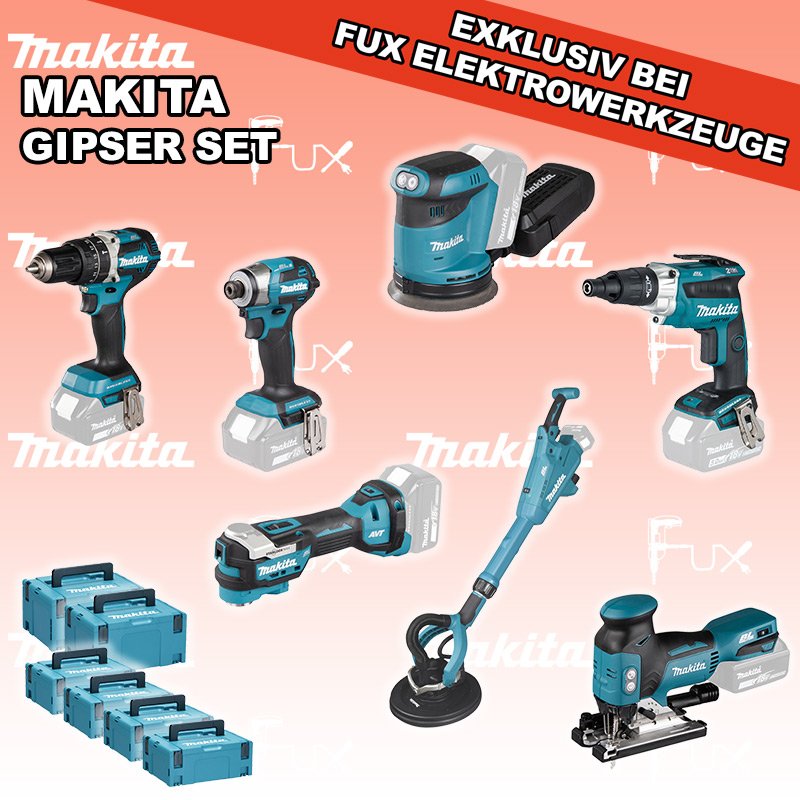 Das Ladenlokal bleibt vom 25. Dezember 2025 bis am 04. Januar 2026 geschlossen. Bestellungen und Lieferungen von Neugeräten werden trotz Ferienabwesenheit in gewohnter Fux-Manier entgegengenommen und ausgeliefert. Zu "Gipser Set" von Makita FUX SPECIAL EXKLUSIV BEI FUX Makita Gipser Set 13 SOLO Bestell- und Artikelnummer: maGipser Set 13 SOLO DHP484ZJ Akku-SchlagbohrschrauberAkkuspannung 18 V Drehzahlen 0-500 / 0-2000 U/min Drehmoment hart / weich 54 / 30 Nm Gewicht 1.6 kgInfos DFS251ZJ Akku-SchrauberAkkuspannung 18 V Drehzahl 0-2500 U/min Werkzeugaufnahme 1/4" (Innensechskant) Gewicht 1.5 kgInfos DSL801ZU Akku-LanghalsschleiferAkkuspannung 18 V Papierdurchmesser 225 mm Verstellbares Teleskoprohr mit 420 mm Spielraum Gewicht 5.8 kgInfos DBO180ZJ Akku-ExzenterschleiferAkkuspannung 18 V Exzenterhub 2,8 mm Schleifteller (Ø) 125 mm Gewicht 3.6 kgInfos DTM52Z Multifunktions WerkzeugAkkuspannung 18 V Schwingungen 10000 - 20000 min-1 Werkzeugaufnahme Starlock Max System Gewicht inkl. Akku 2.0 kg Infos DJV18ZJ Akku-StichsägeAkkuspannung 18 V Hubzahl 800 - 3500/ min Schnittleistung Holz 135 mm / Stahl 10 mm Gewicht 2.5 kgInfos DTD173Z Akku-SchlagschrauberAkkuspannung 18 V Anziehdrehmoment 20 / 50 / 170 / 180 Nm Werkzeugaufnahme 1/4" (Innensechskant) Gewicht inkl. Akku 1.2 - 1.5 kgInfos MAKPAC Gr. 3Produktabmessung (L x B x H) 377 x 277 x 176 mm Infos Einsatz für DTM52 Einsatz für DTM52 Makpac Koffer Typ C (821551-8) Infos MAKPAC Gr. 2Produktabmessung (L x B x H) 395 x 295 x 163 mm Infos Einsatz für diverse Schlagschrauber Einsatz für DDF083, DDF483, DHP483, DTD134, DTD137, DTD146, DTD148, DTD152, DTD153, DTD154, DTD155, DTD170, DTD171, DTP131, DTP141, DTS130, DTS131, DTS141, DTW180, DTW181, DTW250, DTW251, DTW284, DTW285Infos OHNE AKKUS UND LADEGERÄT Standard-Ausrüstung In diesem Set enthalten: DHP484ZJ Akku-Schlagbohrschrauber DFS251ZJ Akku-Schrauber DSL801ZU Akku-Langhalsschleifer DBO180ZJ Akku-Exzenterschleifer DTM52Z Multifunktions Werkzeug DJV18ZJ Akku-Stichsäge DTD173Z Akku-Schlagschrauber MAKPAC Gr. 3 Einsatz für DTM52 MAKPAC Gr. 2 Einsatz für diverse Schlagschrauber Geliefert im Koffer Zubehör Listenpreis CHF 2'421.00 Fuxpreis CHF 1'639.00 inkl. 8.1% MwSt, inkl vRG Versand CHF 20.00 Kein Grauimport! Produkt bestellen 1 Stück 2 Stück 3 Stück 4 Stück 5 Stück 6 Stück 7 Stück 8 Stück 9 Stück 10 Stück Option: Makita BL 1860 B ( Li-lon Akku ) für CHF 95.- statt CHF 124.-Infos Alle Angaben ohne Gewähr und solange Vorrat reicht!Wiederverkäufer werden? Produkt als PDF NEUHEITAKTION 32%