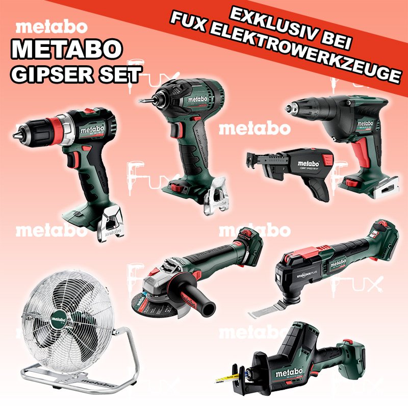 Das Ladenlokal bleibt vom 25. Dezember 2025 bis am 04. Januar 2026 geschlossen. Bestellungen und Lieferungen von Neugeräten werden trotz Ferienabwesenheit in gewohnter Fux-Manier entgegengenommen und ausgeliefert. Zu "Gipser Set" von Metabo FULL Service: 36 Monate zum Nulltarif für Sie! Weitere Infos zum FULL Service FUX SPECIAL EXKLUSIV BEI FUX Metabo Gipser Set 5 SOLO Bestell- und Artikelnummer: Gipser Set 5 SOLO BS 18 L BL Q Akku-BohrschrauberAkkuspannung 18 V Drehzahl 0 - 500 / 0 - 1700 /min Drehmoment hart / weich 60 / 28 Nm Gewicht (mit Akkupack) 1.3 kgInfos TBS 18 LTX BL 5000 Akku-TrockenbauschrauberAkkuspannung 18 V Leerlaufdrehzahl 0 - 5.000 /min Max. Drehmoment weich 6 Nm Gewicht mit Akkupack 1,3 kgInfos SSD 18 LTX 200 BL Akku-Schlagschrauber Akkuspannung 18 V Anziehdrehmoment 200 Nm Werkzeugaufnahme 1/4" Gewicht 1.3 kgInfos WVB 18 LT BL 11-125 Quick Akku-WinkelschleiferAkkuspannung 18 V Drehzahl 2.800 - 10.000 / min Ø 125 mm Scheiben Gewicht (mit Akkupack) 2.5 kgInfos SSE 18 LTX BL Compact Akku-SäbelsägeAkkuspannung 18 V Hubzahl 0-3000 min-1 Hublängen 16 mm Gewicht (mit Akkupack) 1.8 kgInfos MT 18 LTX BL QSL Akku-Multitool Akkuspannung 18 V Schwingzahl bei Leerlauf 8.000 - 20.000 /min Schleifplatte, Maß Eck zu Eck 93 mm Gewicht 1.7 kgInfos AV 18 Akku-VentilatorAkkuspannung 18 V Max. Luftgeschwindigkeit 3,8 m/s Flügeldurchmesser 355 mm Gewicht (mit Akkupack) 1,2 kgInfos Schrauber-Magazin Speed Fix 57Robustes Schrauber-Magazin geeignet für TBS 18 LTX 5000 und HBS 18 LTX 3000Infos Ergattere dir einen Akku bei der Registration auf metabo.ch Alle Produkte dieser Aktion anzeigen OHNE AKKUS UND LADEGERÄT Standard-Ausrüstung In diesem Set enthalten: BS 18 L BL Q Akku-Bohrschrauber TBS 18 LTX BL 5000 Akku-Trockenbauschrauber SSD 18 LTX 200 BL Akku-Schlagschrauber WVB 18 LT BL 11-125 Quick Akku-Winkelschleifer SSE 18 LTX BL Compact Akku-Säbelsäge MT 18 LTX BL QSL Akku-Multitool AV 18 Akku-Ventilator Schrauber-Magazin Speed Fix 57 Listenpreis CHF 1'924.50 Fuxpreis CHF 1'310.00 inkl. 8.1% MwSt, inkl vRG Frankolieferung Kein Grauimport! Produkt bestellen 1 Stück 2 Stück 3 Stück 4 Stück 5 Stück 6 Stück 7 Stück 8 Stück 9 Stück 10 Stück Alle Angaben ohne Gewähr und solange Vorrat reicht!Wiederverkäufer werden? Produkt als PDF NEUHEITAKTION 31%
