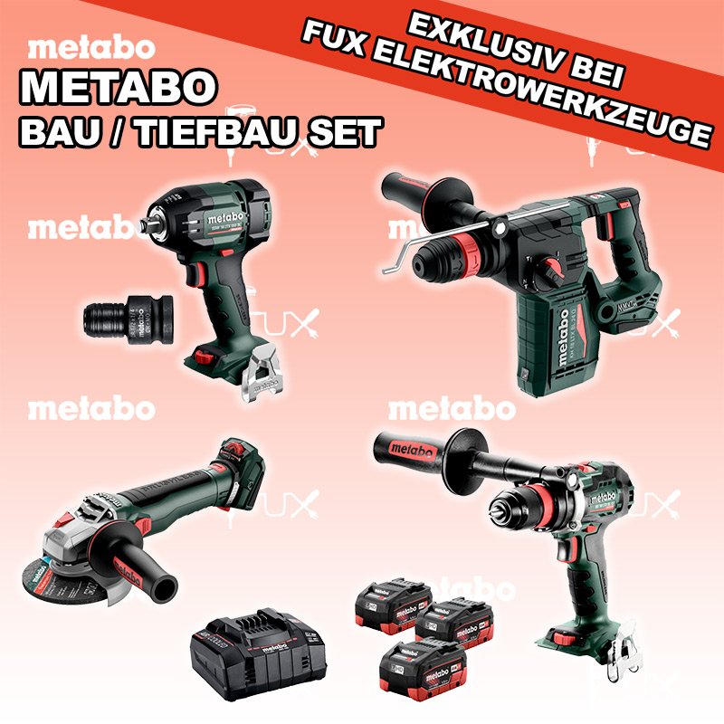 Zu "Bau / Tiefbau Set" von Metabo FULL Service: 36 Monate zum Nulltarif für Sie! Weitere Infos zum FULL Service FUX SPECIAL EXKLUSIV BEI FUX Metabo Bau / Tiefbau Set 7 Bestell- und Artikelnummer: Bau / Tiefbau Set 7 BS 18 LTX BL Q I Akku-BohrschrauberAkkuspannung 18 V Drehzahl 0-550 / 0-2000 U/min Drehmoment hart / weich 130 / 65 Nm Gewicht (mit Akkupack) 2.3 kgInfos KH 18 LTX BL 24 Q Akku-KombihammerAkkuspannung 18 V Einzelschlagstärke 2.2 J Bohrleistung in Beton 24 mm Gewicht ohne Akkupack 3 kgInfos WVB 18 LT BL 11-125 Quick Akku-WinkelschleiferAkkuspannung 18 V Drehzahl 2.800 - 10.000 / min Ø 125 mm Scheiben Gewicht (mit Akkupack) 2.5 kgInfos SSW 18 LTX 550 BL Akku-SchlagschrauberAkkuspannung 18 V Anziehdrehmoment 550 Nm Werkzeugaufnahme 1/2" Gewicht ohne Akkupack 1,4 kgInfos 3 x 18 V, 5.5 Ah, LiHD Akkupack18 V 5.5 Ah ( LiHD Akkus ) Infos ASC 145, 12 - 36 V "Air Cooled" LadegerätZum Aufladen aller Li-Power Schiebesitz-Akkupacks (12 V - 36 V). Ladestrom 8.0 AInfos Adapter mit 1/2“ auf 1/4"Adapter mit 1/2“ Innenvierkant maschinenseitig und 1/4“ Innensechskant für schlagfeste Einsatzwerkzeuge mit 1/4“ SchaftInfos Registriere die in diesem Set vorhandenen Metabo Maschinen auf metabo.ch, und ergattere dir bis zu 5 Gratis Akkus!Zusätzlich offerieren wir zu diesem Set einen Gratis Akku! Standard-Ausrüstung In diesem Set enthalten: BS 18 LTX BL Q I Akku-Bohrschrauber KH 18 LTX BL 24 Q Akku-Kombihammer WVB 18 LT BL 11-125 Quick Akku-Winkelschleifer SSW 18 LTX 550 BL Akku-Schlagschrauber 3 x 18 V, 5.5 Ah, LiHD Akkupack ASC 145, 12 - 36 V "Air Cooled" Ladegerät Adapter mit 1/2“ auf 1/4" Listenpreis CHF 1'863.00 Fuxpreis CHF 1'273.00 inklusive 8.1% MwSt Frankolieferung Kein Grauimport! Produkt bestellen 1 Stück 2 Stück 3 Stück 4 Stück 5 Stück 6 Stück 7 Stück 8 Stück 9 Stück 10 Stück Alle Angaben ohne Gewähr und solange Vorrat reicht!Wiederverkäufer werden? Produkt als PDF NEUHEITAKTION 31%