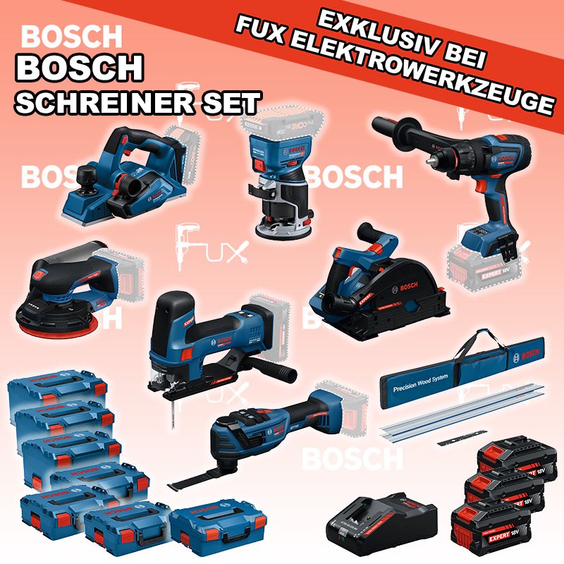 Bosch Expert EXSchreiner Set 10 EXST18V-155S Akku-Stichsäge EXSR18V-150 Akku-Bohrschrauber GKF 18V-8 Akku-Kantenfräse EXKT18V-52G Akku-Tauchsäge GHO 18V-26 Akku-Einhandhobel EXOP18V-40 Akku-Multi-Cutter EXEX18V-150-5 Akku-Exzenterschleifer FSN 1400 Set Führungsschienensysteme Systemzubehör 3x EXBA18V-80 + EXAL18V-160 Starter-Set