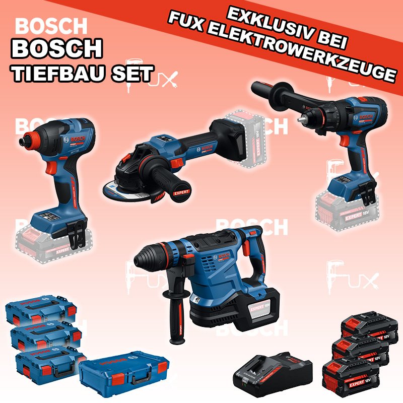 Zu "Bau / Tiefbau Set" von Bosch Professional FUX SPECIAL EXKLUSIV BEI FUX Bosch Expert EXTiefbau Set 6 Bestell- und Artikelnummer: EXTiefbau Set 6 5 Jahre Garantie auf Bosch Expert Maschinen / Zubehör EXSR18V-150 Akku-BohrschrauberAkkuspannung 18 V Drehmoment 84 / 100 / 150 Nm Leerlaufdrehzahl 0 – 550 / 0 – 2200 min⁻¹ Gewicht exkl. Akku 2.1 kgInfos EXBH18V-32F Akku-BohrhammerAkkuspannung 18 V Nenn-Schlagenergie 4.5 J Schlagzahl bei Nenndrehzahl 4300 bpm Nenndrehzahl 0 – 790 min⁻¹ Gewicht exkl. Akku 4.2 kgInfos EXWS18V-15S Akku-WinkelschleiferAkkuspannung 18 V Leerlaufdrehzahl 11000 min⁻¹ Scheiben-Ø 125 mm Gewicht exkl. Akku 2.2 kgInfos EXDX18V-210 Akku-DrehschlagschrauberAkkuspannung 18 V Drehmoment. max. 210 Nm Leerlaufdrehzahl 0 - 1100 / 0 - 1700 / 0 - 2300 min⁻¹ Schlagzahl 0 - 4000 bpm Gewicht exkl. Akku 1.2 kgInfos 3x EXBA18V-80 + EXAL18V-160 Starter-Set3 x EXBA18V-80 Akkupack EXAL18V-160 LadegerätInfos Standard-Ausrüstung In diesem Set enthalten: EXSR18V-150 Akku-Bohrschrauber EXBH18V-32F Akku-Bohrhammer EXWS18V-15S Akku-Winkelschleifer EXDX18V-210 Akku-Drehschlagschrauber 3x EXBA18V-80 + EXAL18V-160 Starter-Set Geliefert im Koffer Zubehör Listenpreis CHF 2'322.70 Fuxpreis CHF 1'803.00 inklusive 8.1% MwSt Kostenloser Versand Kein Grauimport! Produkt bestellen 1 Stück 2 Stück 3 Stück 4 Stück 5 Stück 6 Stück 7 Stück 8 Stück 9 Stück 10 Stück Alle Angaben ohne Gewähr und solange Vorrat reicht! Produkt als PDF NEUHEITAKTION 22%